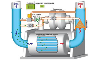 Auto Tube Cleaning System (Ball Type) : This special system uses sponge balls which passes through the condenser tubes at programmable intervals . These sponge balls collects all sediments from the tubes inner surfaces without causing any disturbance to the water flow and pressures. (Learn More…)